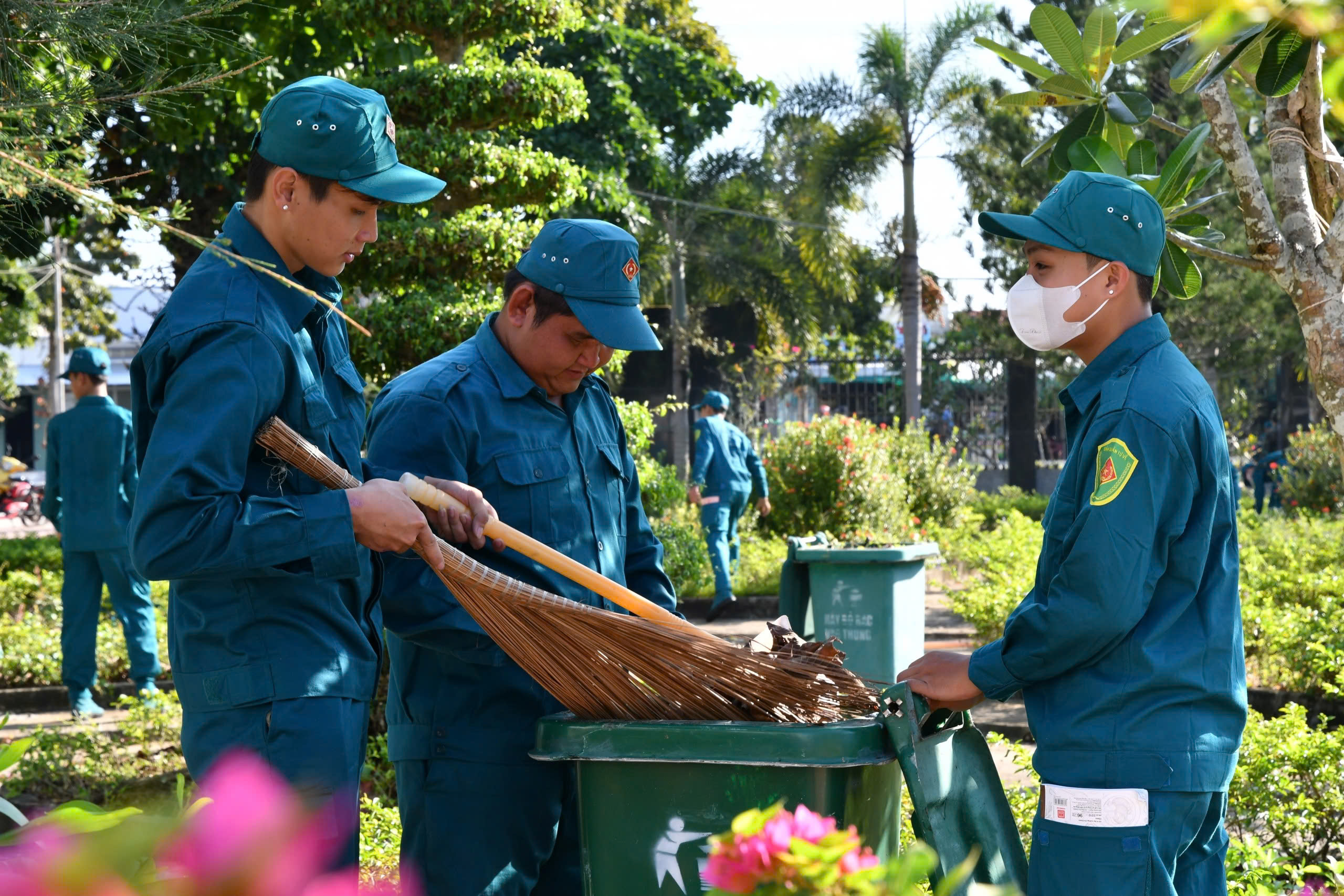 Các chiến sĩ dân quân thường trực huyện Hòn Đất đang làm vệ sinh tại khuôn viên Nghĩa trang liệt sĩ huyện Hòn Đất
