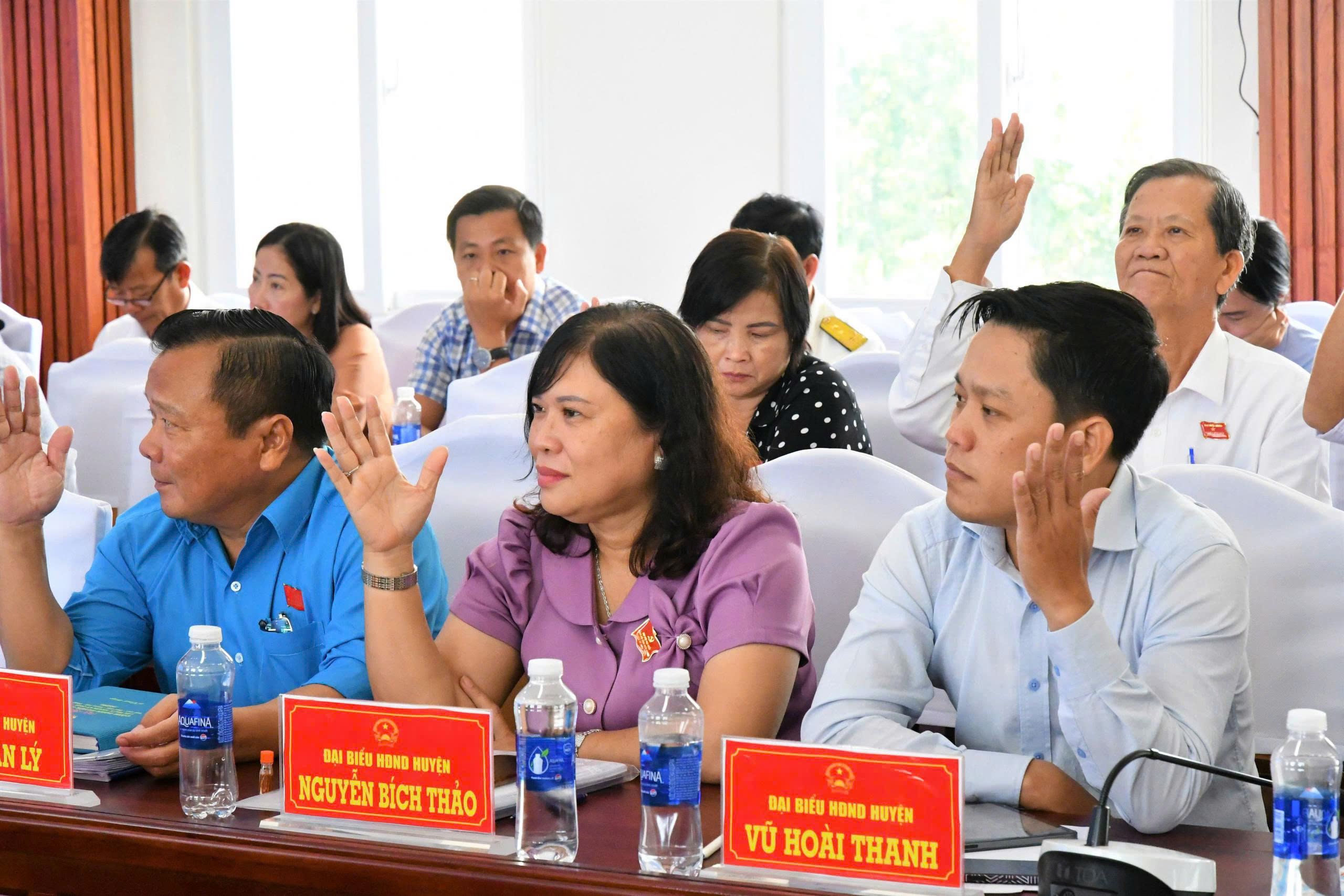 Các đại biểu biểu quyết thông qua Nghị quyết miễn nhiệm Trưởng Ban Kinh tế - Xã hội HĐND huyện Hòn Đất khoá X, nhiệm kỳ 2021 - 2026