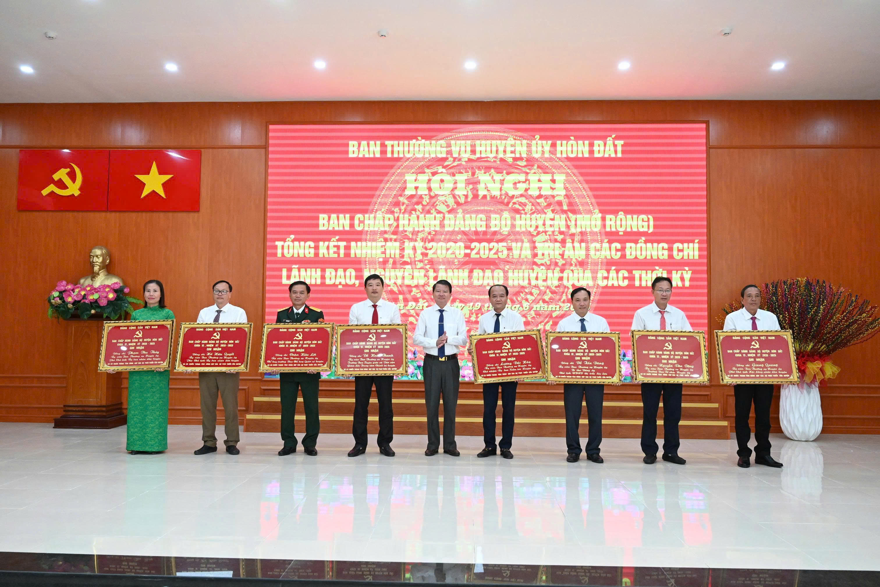 Lãnh đạo huyện Hòn Đất tặng quà tặng lưu niệm của Ban Chấp hành Đảng bộ huyện khóa XI cho các đồng chí lãnh đạo, nguyên lãnh đạo huyện qua các thời kỳ