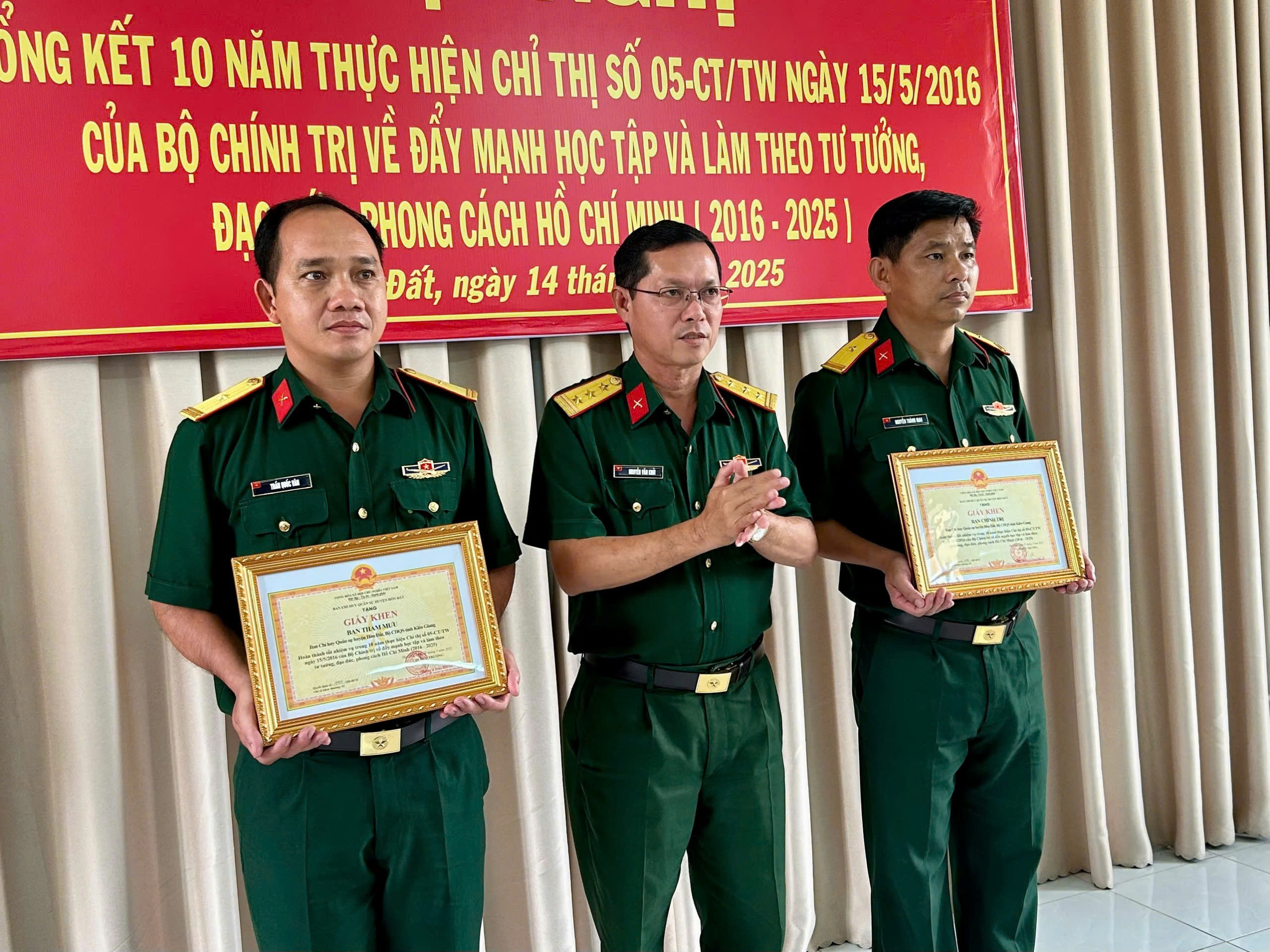 Dịp này, Ban Chỉ huy Quân sự huyện Hòn Đất tặng giấy khen cho 2 tập thể và 5 cá nhân hoàn thành tốt nhiệm vụ trong thực hiện Chỉ thị số 05-CT/TW ngày 15/5/2016 của Bộ Chính trị về đẩy mạnh học tập và làm theo tư tưởng, đạo đức, phong cách Hồ Chí Minh (2016 - 2025)./.