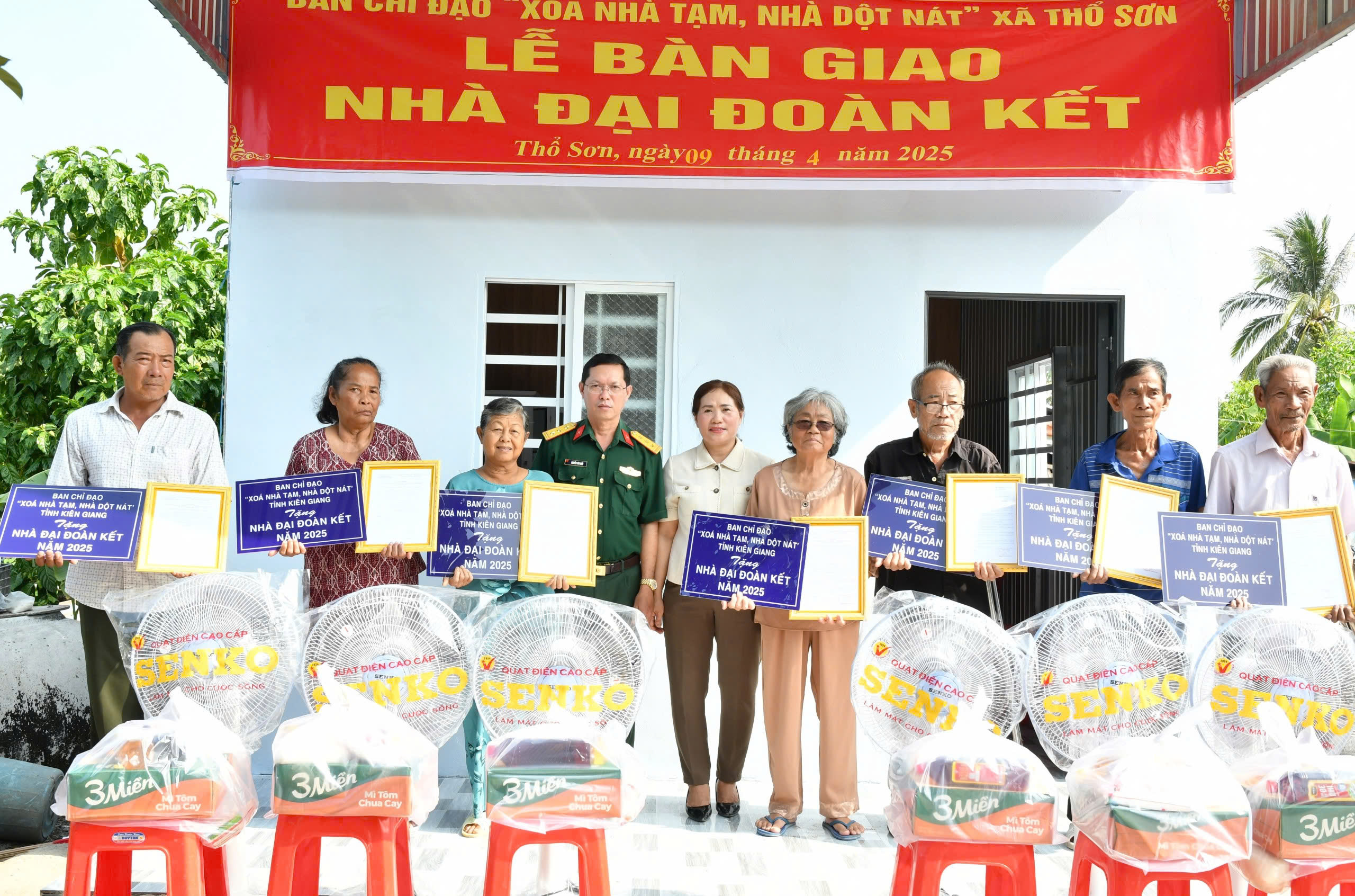 Ngày 09/4/2025, Ban chỉ đạo “Xoá nhà tạm, nhà dột nát” xã Thổ Sơn, huyện Hòn Đất tổ chức Lễ bàn giao 07 căn nhà Đại đoàn kết và khởi công 08 căn cho hộ cận nghèo trên địa bàn xã, nhằm tạo mọi điều kiện để người dân an cư. Đến dự và trao quyết định bàn giao nhà có Thượng tá Nguyễn Văn Khởi – Huyện uỷ viên, Phó Bí thư Đảng uỷ Quân sự huyện, Chính trị viên Ban chỉ huy quân sự huyện; Đồng chí Trần Thị Lệ Hiền - Huyện uỷ viên, Bí thư Đảng uỷ xã Thổ Sơn, Trưởng Ban chỉ đạo “Xoá nhà tạm, nhà dột nát” xã Thổ Sơn; Lãnh đạo chính quyền địa phương, các ngành đoàn thể, Ban lãnh đạo các ấp trên địa bàn xã.