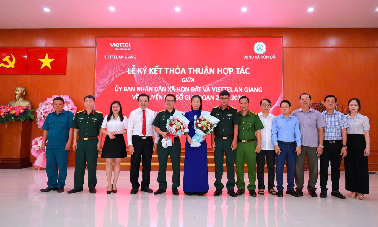 Ngày 8/12, UBND xã Hòn Đất và Viettel An Giang - Chi nhánh Tập đoàn Công nghiệp – Viễn thông Quân đội long trọng tổ chức Lễ ký kết Thỏa thuận hợp tác “Triển khai chuyển đổi số và tuyên truyền, cổ động trực quan các nhiệm vụ chính trị; kết hợp quảng cáo thương mại trên địa bàn xã Hòn Đất giai đoạn 2025 – 2030”. Tham dự lễ ký kết có đồng chí Dương Minh Tâm – Bí thư Đảng ủy, Trưởng Ban Chỉ đạo về phát triển khoa học, công nghệ, đổi mới sáng tạo và chuyển đổi số xã Hòn Đất; Đồng chí Phạm Thu Thủy – Phó Bí thư Đảng ủy, Chủ tịch UBND xã Hòn Đất; Các đồng chí trong Ban Thường vụ, Ban Chấp hành Đảng ủy xã Hòn Đất; Trung tá Đỗ Thanh Tuấn – Phó Bí thư Đảng ủy – Giám đốc Viettel An Giang; Thiếu tá Nguyễn Minh Chí – Phó Giám đốc Viettel An Giang; Trung tá Phạm Văn Tế – Giám đốc Viettel cụm Hòn Đất; Lãnh đạo các phòng, ban chuyên môn, ban lãnh đạo các ấp trên địa bàn xã.